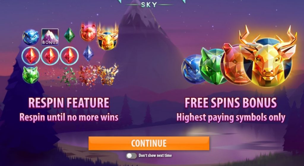 Бонусный символ в игровом аппарате Northern Sky – это изображение гор с надписью бонус. Сам элемент не складывает призовые комбинации. При выпадении в любой части игрового поля трех и более бонусов активируются бесплатные вращения.