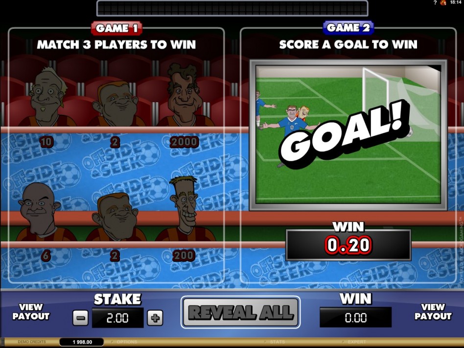 Чтобы во второй игре получить выигрыш, футболист должен забить гол. Причем повлиять на этот процесс гемблер не может. Ему приходится надеяться на случай. Это обычная моментальная лотерея, в которой клиенту может повезти или нет. Размер выигрыша указан под анимацией и отображается при нажатии на кнопку «Click to Reveal Prize». В отдельном окошке видна общая сумма прибыли за один турнир.