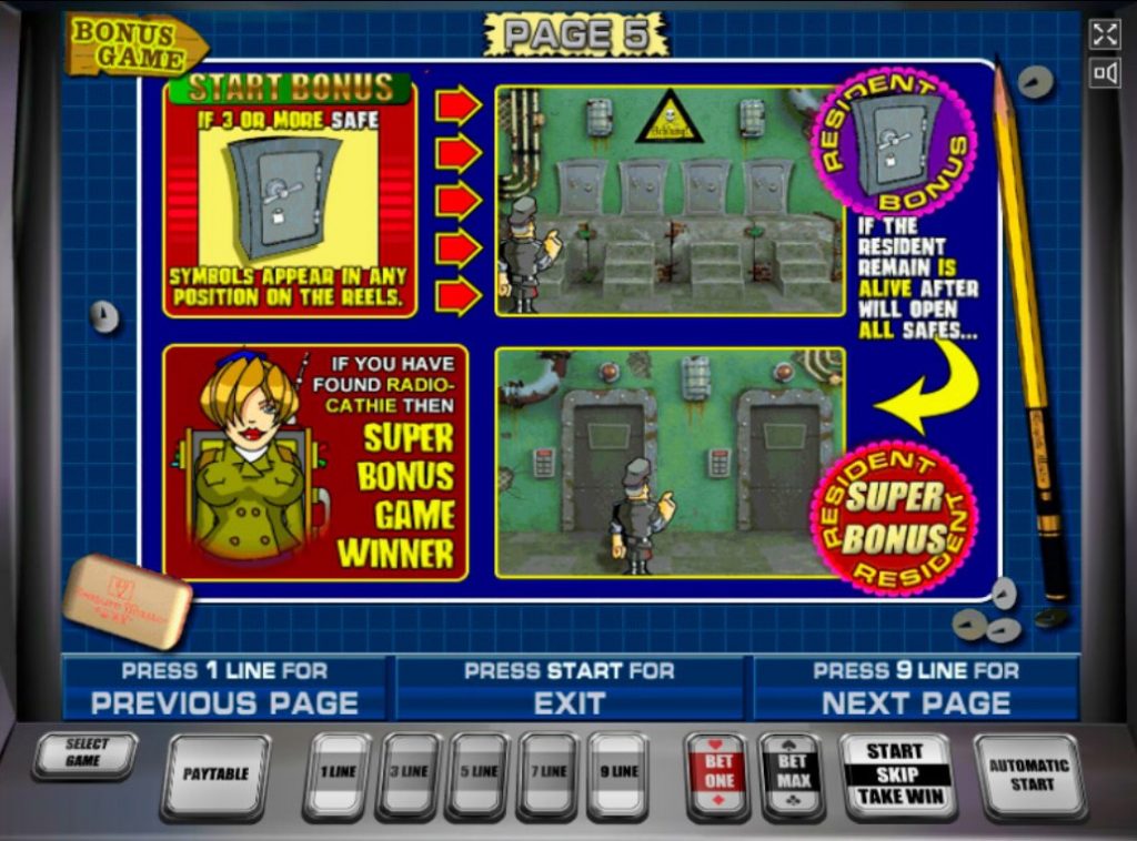 При совпадении минимум трех одинаковых картинок в игровом аппарате Резидент автоматически запускается бонусная игра. Здесь гемблеру нужно открывать сейфы и получать вознаграждение за найденные вещи. После открывания сейфа с динамитом игра прекращается, но все накопленные деньги сохраняются. Удачное вскрытие 4-х сейфов запускает супербонусную игру, где игрок открывает двери в поисках радистки Кет. Найдя ее, он получит приз.
