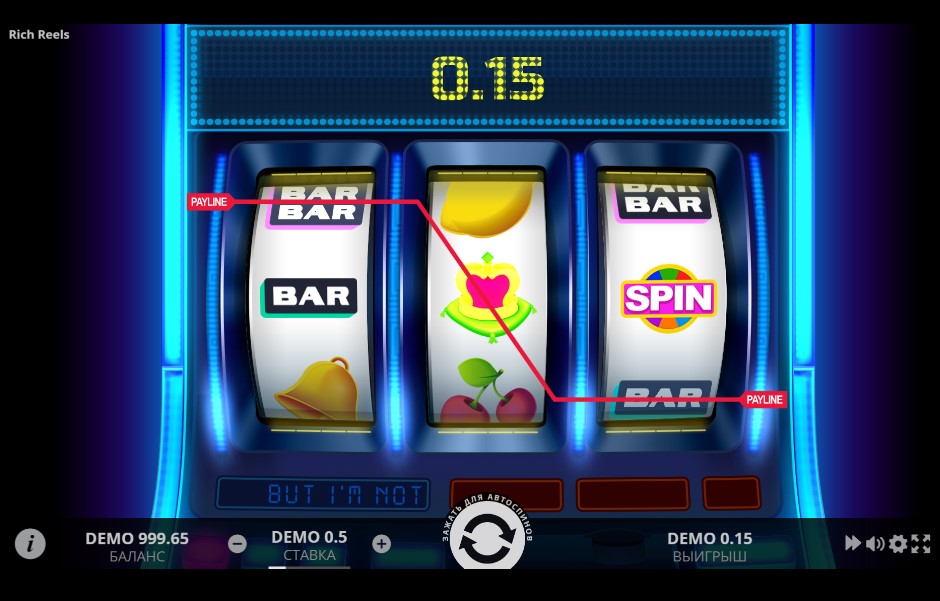 Игровой аппарат Rich Reels – это классическая модель с тремя барабанами и пятью постоянно активными игровыми полосами. Игру нельзя запускать в режиме автоматических вращений, что может показаться неудобным некоторым игрокам. При выпадении определенной комбинации символов в слоте можно сорвать накопительный приз.