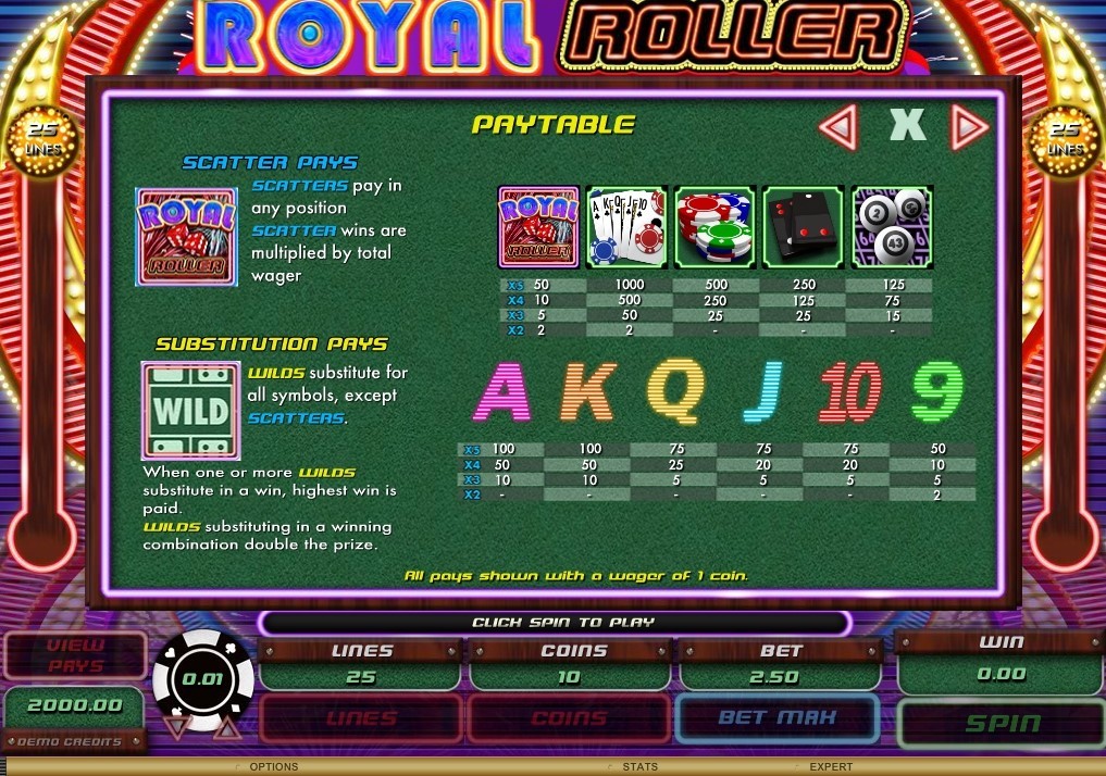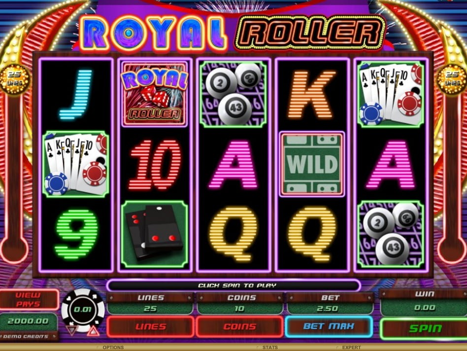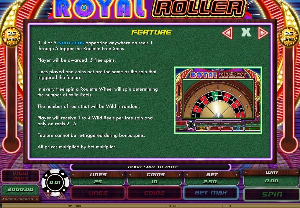 Аппарат Royal Roller – это классическая игровая модель с пятью катушками и 25-ю линиями. Игрок имеет возможность активировать любое количество полос. В слоте нет прогрессивного джекпота, зато благодаря бонусной игре и спецсимволом гемблер может выиграть много денег.
