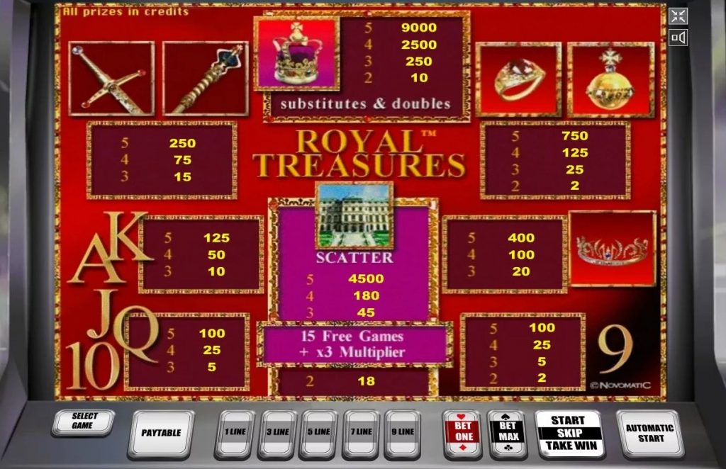 Разработчиком игрового автомата Royal Treasures является австрийская компания Новоматик. Название игры в переводе означает Королевские сокровища. Игрок получает возможность посетить сокровищницу коронованных особ и пройтись по их оружейным залам.
