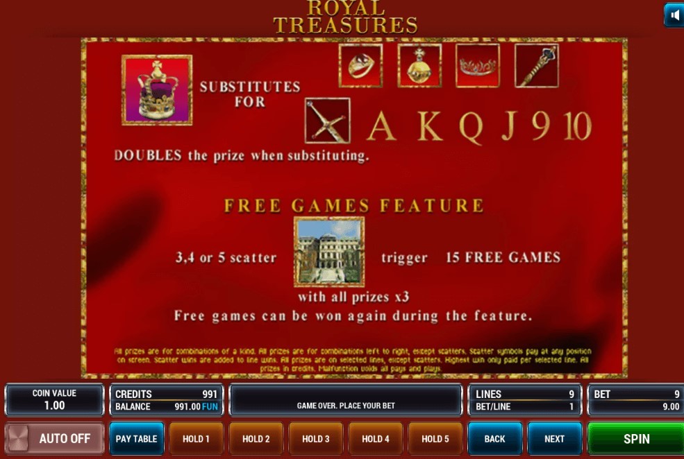 - За три совпадения королевского скипетра ставка увеличится на 15 монета, за четыре – на 75, а за пять – на 250.