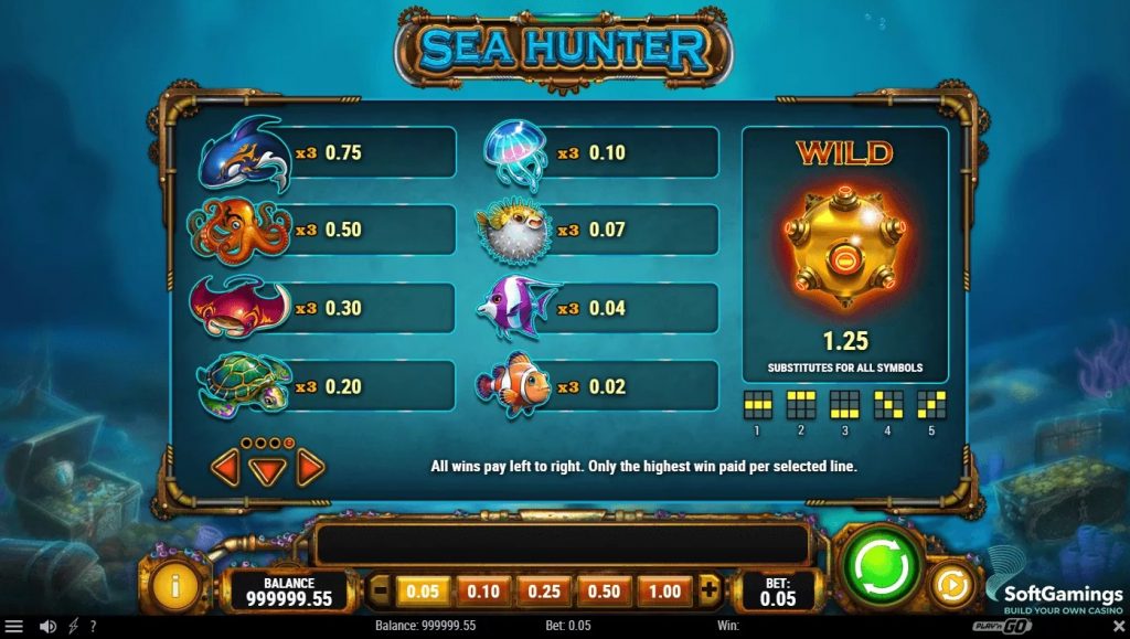 Разобраться в игровом автомате Sea Hunter может даже новичок, поскольку в слоте всего три барабана и пять полос для выплат. Все линии фиксированные, поэтому игрок не может самостоятельно менять их количество. Игра не предусматривает наличие накопительного джекпота.
