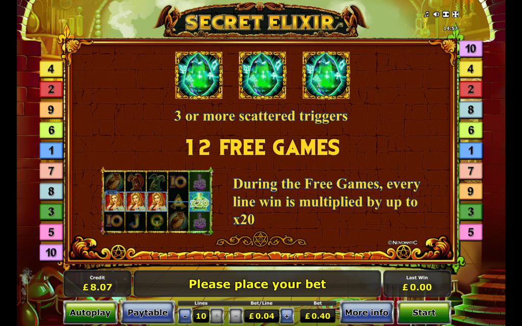 Чтобы играть в автомат Secret Elixir бесплатно, достаточно активировать его в демонстрационном режиме. Причем сделать это могут все посетители казино, независимо от наличия у них регистрации. Чтобы делать ставки, не нужно вносить деньги на депозит, ведь игра ведется на виртуальные денежные единицы.