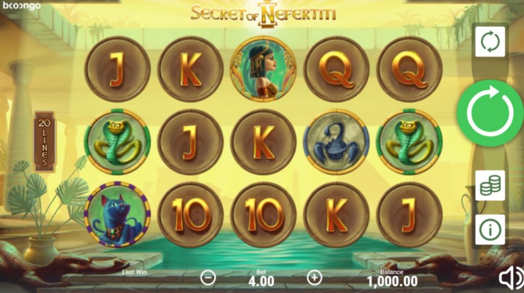 Игровой автомат Secret of Nefertiti – классический видеослот, в котором производитель предусмотрел пять барабанов и 20 фиксированных полос для выплат. Менять количество игровых линий нельзя. В слоте предусмотрены автоматические вращения. Он не рассчитан на накопительный или прогрессивный джекпот.