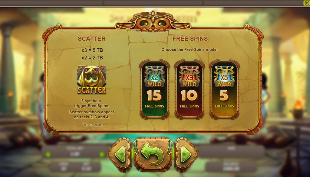 В игровом аппарате Secret of Nefertiti игрок сам выбирает режим бесплатных вращений после выпадения скаттеров. При применении изумрудного вайлда положено 15 фриспинов с коэффициентом х2, красного – 10 спинов с мультипликатором х3, синего – 5 вращений с множителем х5. В спинах принимает участие скаттер, но повторный запуск фриспинов недоступен.