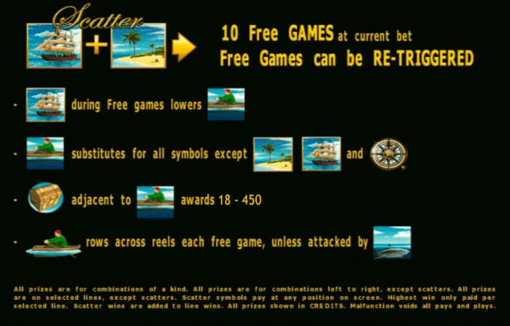 При каждом вращении картинка с пиратом в лодке смещается вправо. При этом вайлд заменяет собой любую символику кроме скаттеров. В качестве случайных призов в бонус-игре использованы картинки с сундуками, которые выпадают вокруг лодки с пиратом. Размер призового фонда от 0,9 до 450 монет. Если дикий символ попадает в одну ячейку с акулой, то он исчезает.