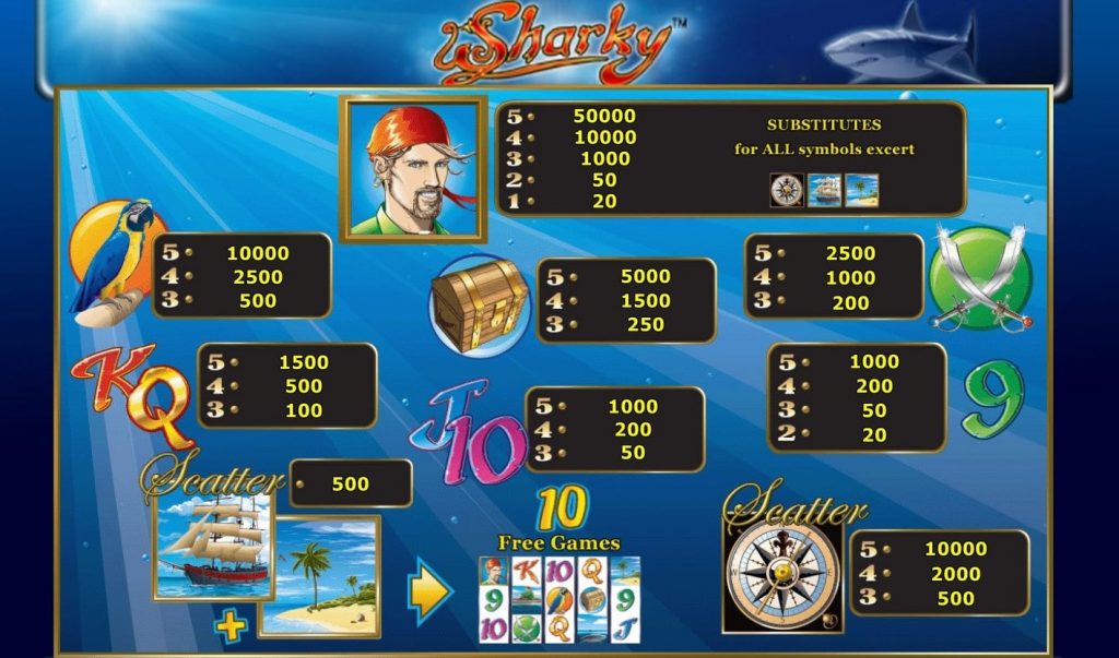 В игровом аппарате Sharky есть базовые картинки, которые при определенном повторении приносят увеличение выигрыша, и специальные символы, заменяющие недостающие элементы и активирующие бонусную игру.