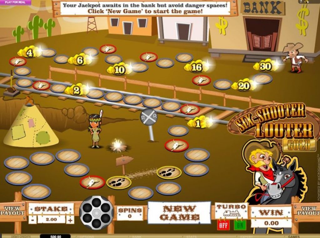Детище компании Microgaming – игровой аппарат Six Shooter Looter Gold не имеет традиционных барабанов и линий для выплат. Слот напоминает игровое поле детской игры. На нем есть клетки, по которым ходит герой. Количество шагов определяется вращением барабана пистолета. После его остановки в нем появляются пули, по их количеству и смотрят, сколько ходов можно сделать.