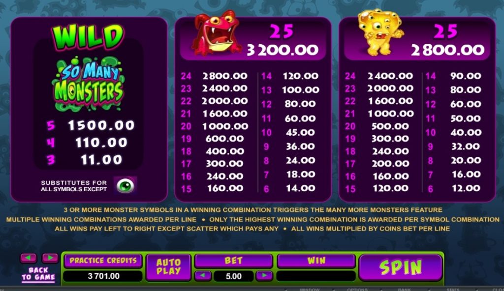 Игровой слот So Many Monsters пятибарабанный, при этом имеет 25 линий. Накопительного джекпота нет. При этом имеются Скаттер и Дикий символы, ставка на одну полосу варьируется от 0,01 до 4-х. Есть фриспины – бесплатные вращения, которые оплачиваются по тройному тарифу.