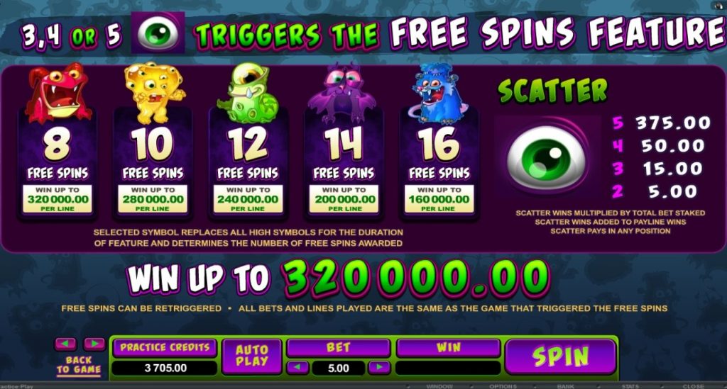 Если выпало три и больше изображений глаза, игроку повезло – он словил бонус. До бонусного раунда пользователю предлагается выбрать монстра – это позволяет определить количество неоплачиваемых вращений (бывает от 8 до 16) и размер предельно возможного выигрыша по одной линии. Все суммы прописаны в информационной таблице.