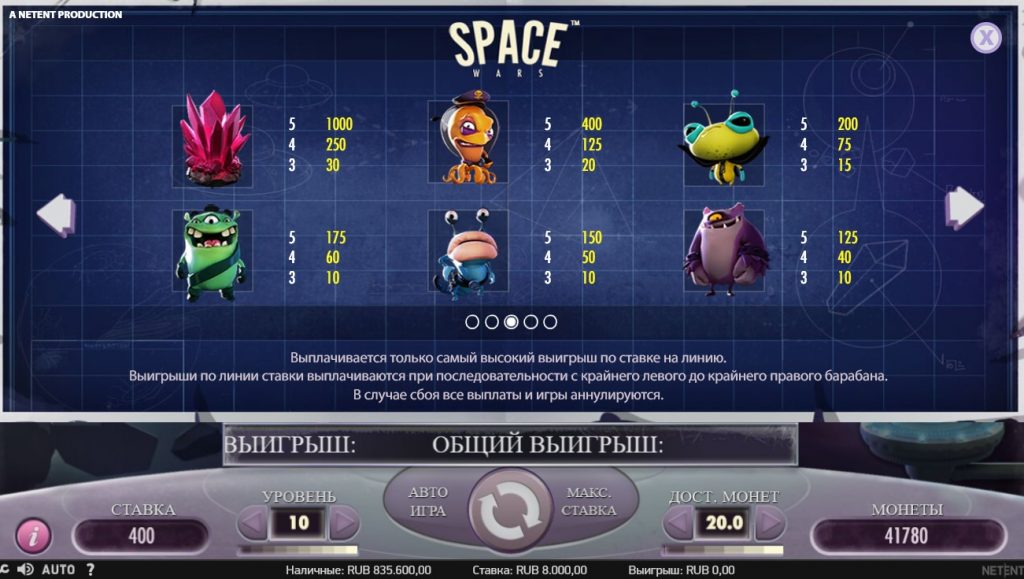 Играть в Space Wars могут как новички, так и профессиональные гемблеры. Первых завлекает необычный сюжет, качественная графика и музыкальное сопровождение, а других – щедрые подарки и респины с размножением символов.