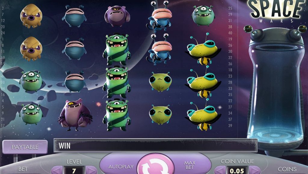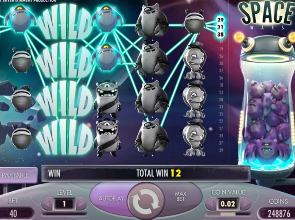 Количество барабанов в Space Wars, линий – 40. Они активны по умолчанию, изменять самостоятельно нельзя. Предельная ставка на спин составляет 200 долларов. Максимальная выплата 1000 к 1. Нет прогрессивного джекпота. Есть Джокер, отсутствует Скаттер. Также нет игры на удвоение. Игрок может сам варьировать номинал монет – от 0,01 до 5.