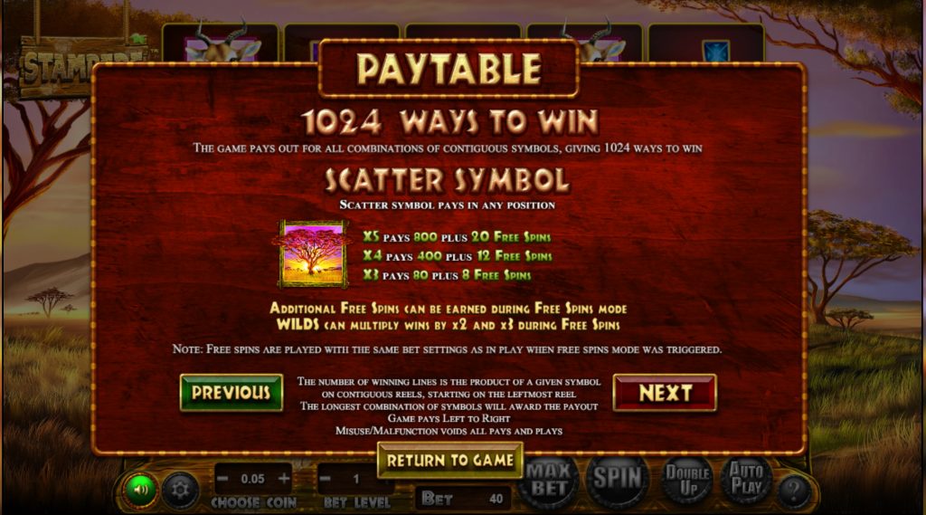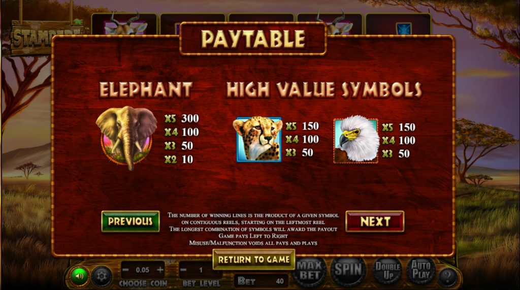 Игровое поле видеослота Stampede имеет формат 5х4. Фоном ему служит африканский пейзаж. Все кнопки управления вынесены в нижнюю часть экрана. Меню не русифицировано, поэтому стоит заранее разобраться с механикой слота.