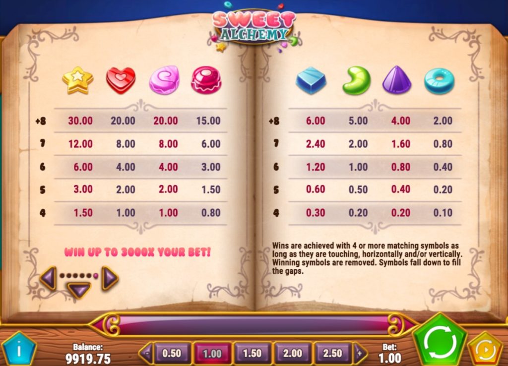 Чтобы получить выигрыш в игровом аппарате Sweet Alchemy, нужно собрать минимум четыре идентичные картинки, которые будут соприкасаться вертикальными или горизонтальными гранями. Они могут располагаться в любых ячейках. В одном спине оплачивают несколько успешных комбинаций.