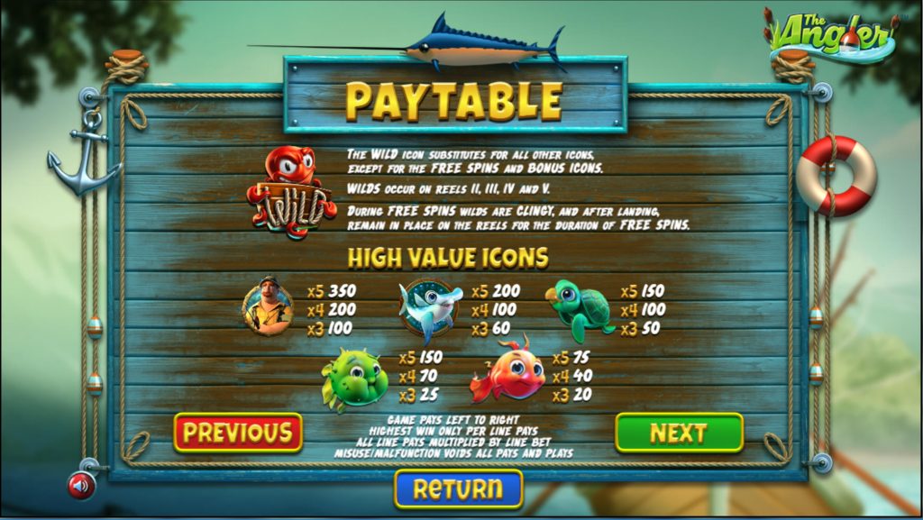 Игровой аппарат The Angler – это азартная машина с пятью катушками. Производитель предусмотрел в ней 20 полос для выплат. Игрок может сам активировать необходимое количество игровых линий. Симулятор не рассчитан на накопительный или прогрессивный денежный приз, зато его можно запускать в автоматическом режиме.