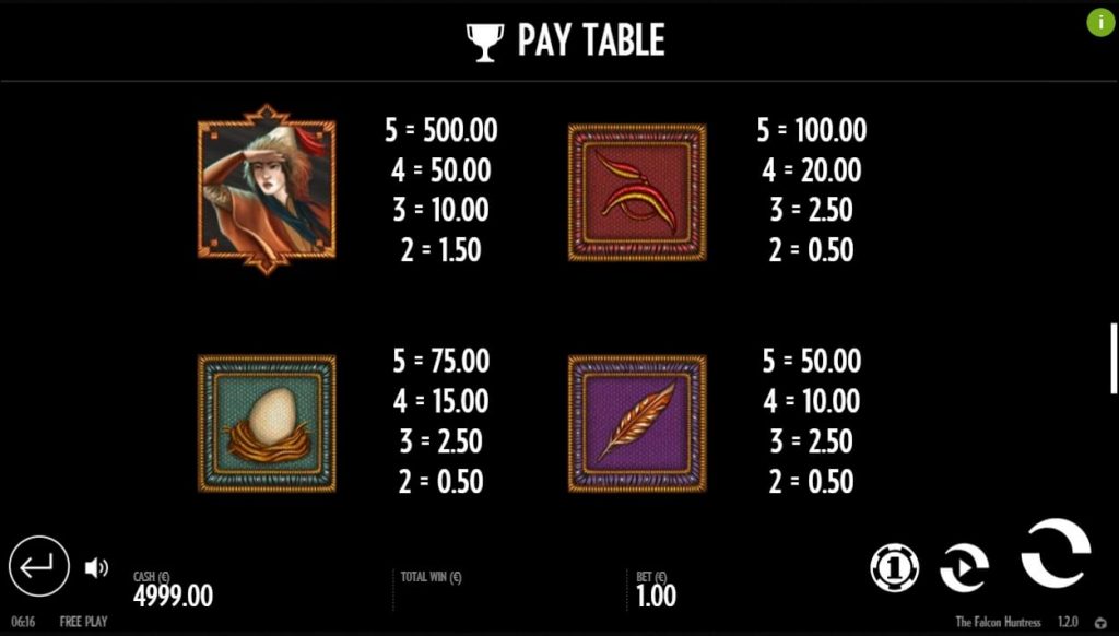 Демо-версия игрового автомата The Falcon Huntress доступна на соответствующих порталах. Можно играть бесплатно и без прохождения регистрация. Управление простое – после выбора ставки на линию игрок крутит барабан посредством нажатия на кнопку Спин или же включает автоматический режим. В последнем случае Авто игру можно остановить в любой момент, например, чтобы изменить ставку на полосу.