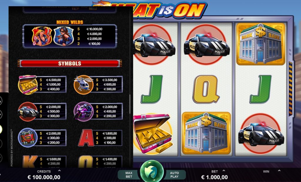 Популярный среди гемблеров игровой автомат The Heat is On (Отопление включено) разработала компания Microgaming. Хоть в качестве главных персонажей слота использованы не типичные образы, а девушки-полицейские, тематика довольно увлекательная. Все посетители симулятора получат порцию азарта, поскольку станут участниками погони.