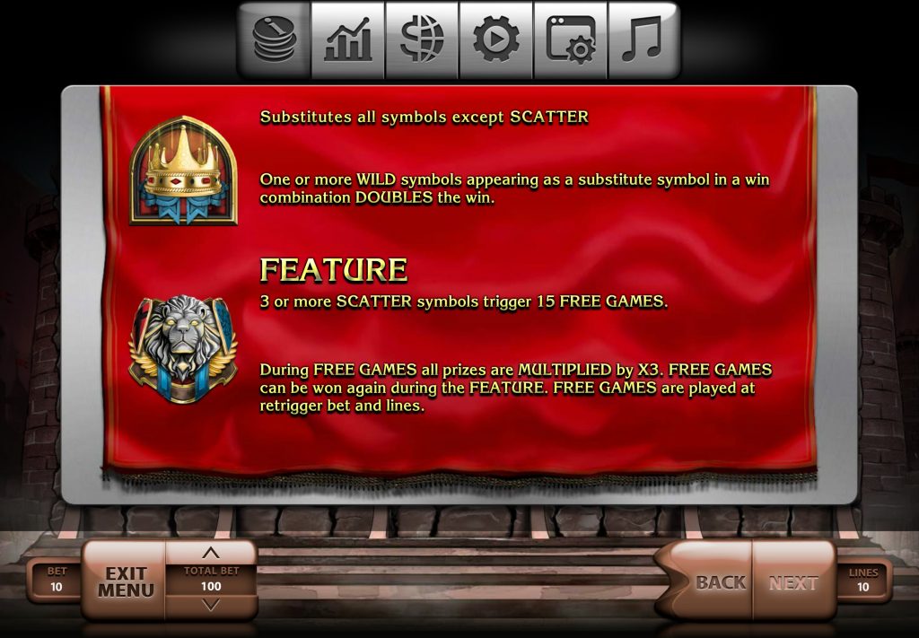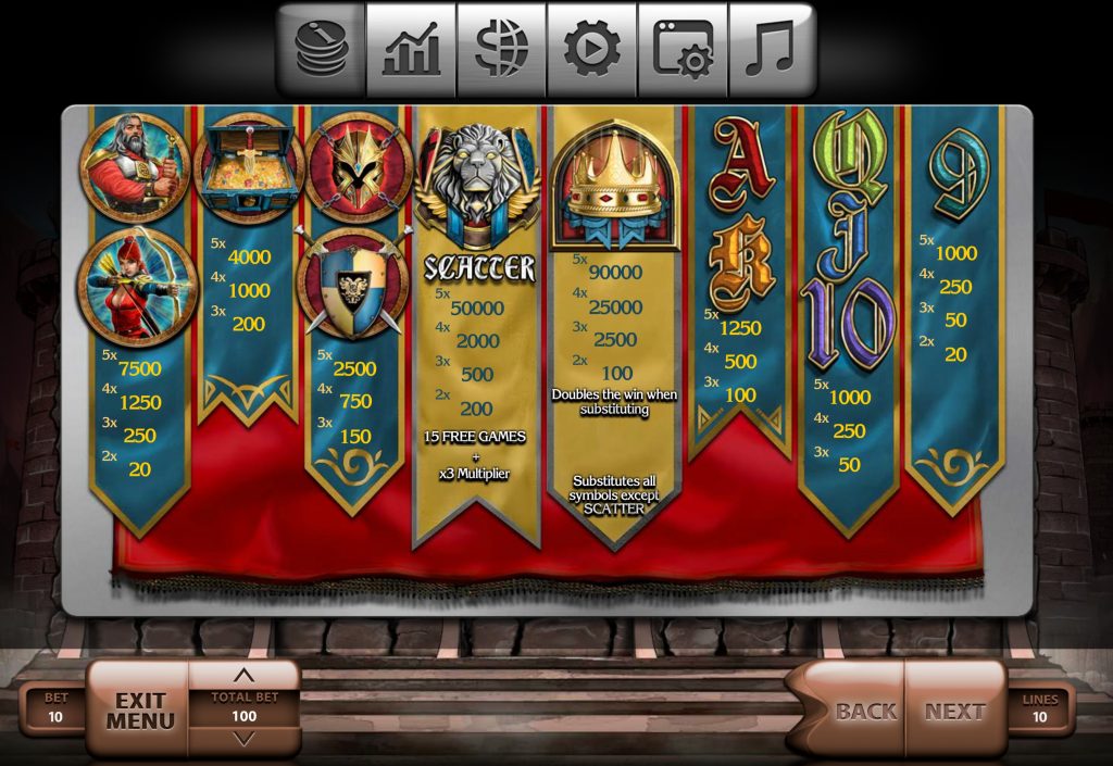 - Картинки с изображением рыцаря при повторении от трех штук принесут гемблеру 25, 125 либо 750 ставок.