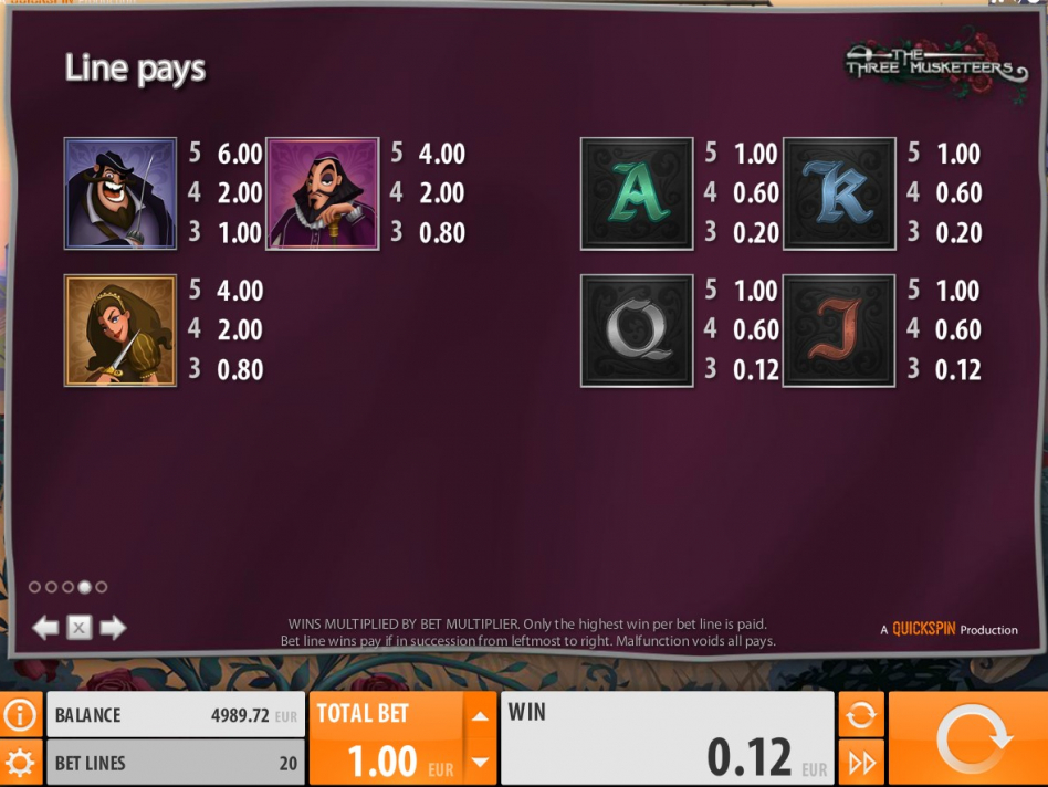 Игровой автомат The Three Musketeers является классическим видеослотом, в котором производитель предусмотрел пять катушек и 20 игровых полос. Количество линий для выплат менять нельзя, поскольку они всегда активны. Слот можно запускать в автоматическом режиме. В нем нет прогрессивного или накопительного призового фонда.