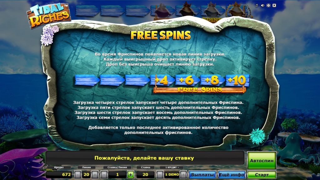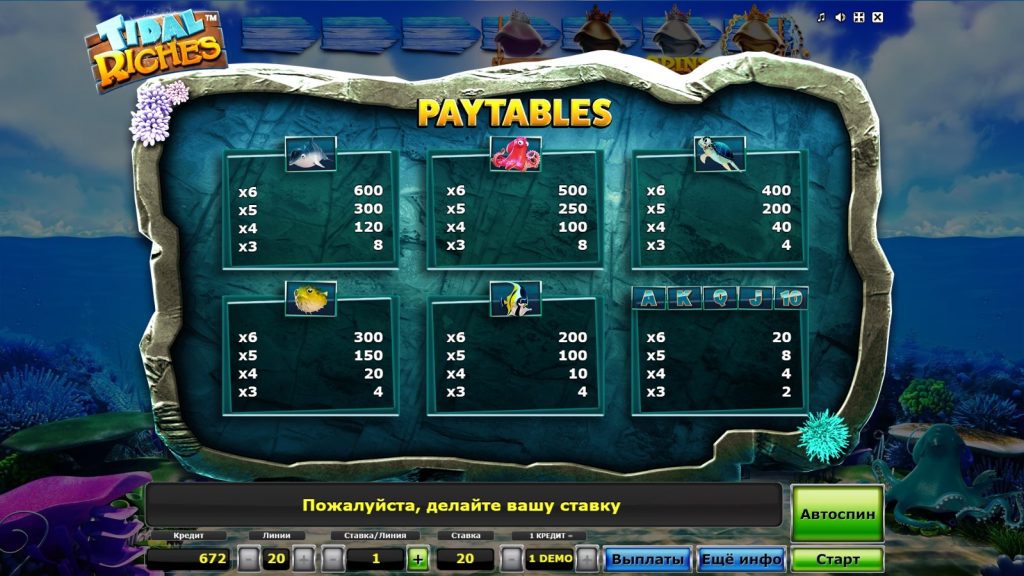 Чтобы активировать симулятор Приливные богатства в демонстрационном режиме, необязательно быть зарегистрированным пользователем. Эта опция доступна всем без исключения посетителям азартного заведения. В демо-режиме играют на виртуальные монеты, поэтому счет не пополняют.