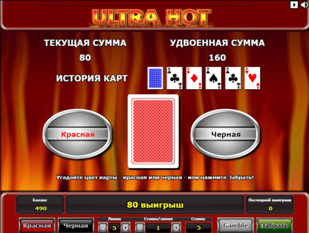 Несмотря на отсутствие бонусной игры и бесплатных вращений, в слоте Ultra Hot можно попытаться удвоить свой выигрыш. Для этого после любого прибыльного спина игрок должен нажать на кнопку «Gamble». Задача гемблера – отгадать цвет карточной масти. Если ему это удастся, то сумма, стоящая на кону, удвоится. Стоит добавить, что в качестве пула в рисковом турнире используют выигрыш за предыдущий спин. Если цвет карты указан неправильно, то все деньги на кону сгорают.