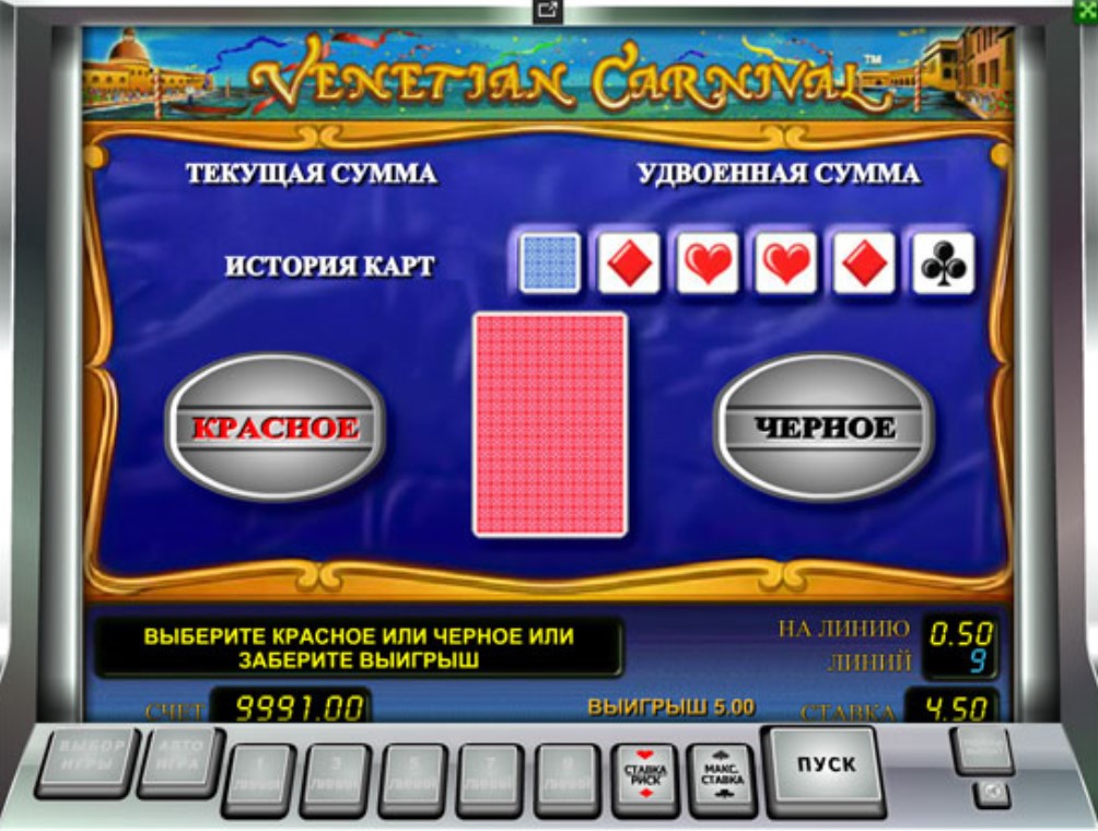Игровой автомат Venetian Carnival – это классический видеослот с пятью барабанами и девятью полосами для выплат. В игре нет прогрессивного джекпота, зато доступны бонусные и рисковые раунды, которые позволяют игроку увеличить свой выигрыш.