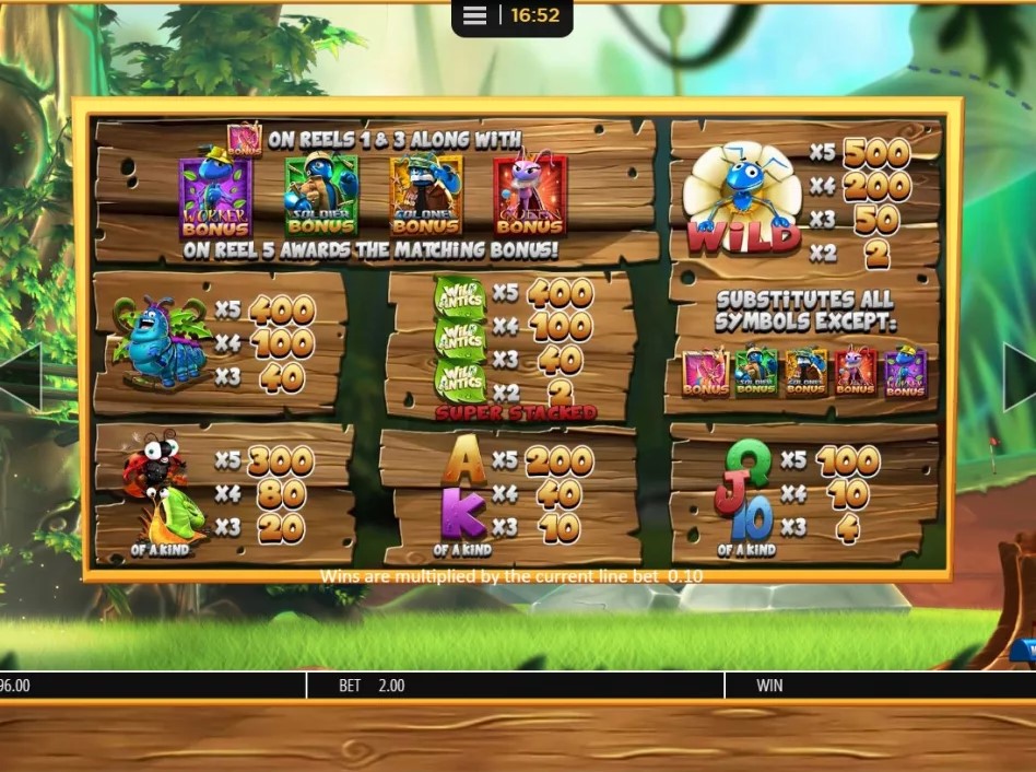 Игровой автомат Wild Antics – это классический видеослот, в котором производитель предусмотрел 5 барабанов и 20 полос для выплат. Все игровые линии постоянно активные, поэтому игрок не может на собственное усмотрение менять их количество. Симулятор можно запускать в автоматическом режиме. Машина не имеет накопительного или прогрессивного призового фонда.